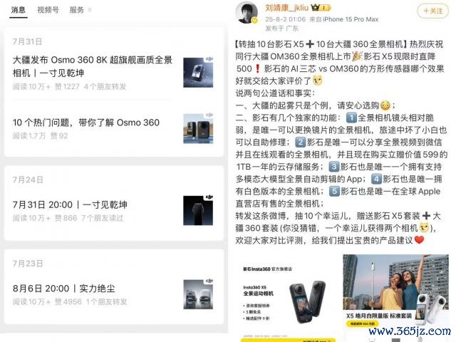其微博骨子先是庆祝同业大疆全景相机上市,随后就给出了"影石 X5 现限时直降 500 "的优惠,并以"转抽 10 台影石 X5+10 台大疆 360 全景相机"的活动敕令群众评价"影石的 AI 三芯 vsOM360 的方形传感器哪个恶果好"。