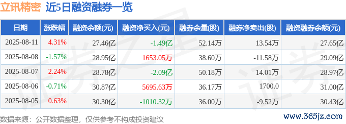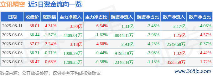 本站音书,截止2025年8月11日收盘,立讯精密(002475)报收于38.01元,高涨4.31%,换手率1.95%,成交量141.48万手,成交额53.51亿元。